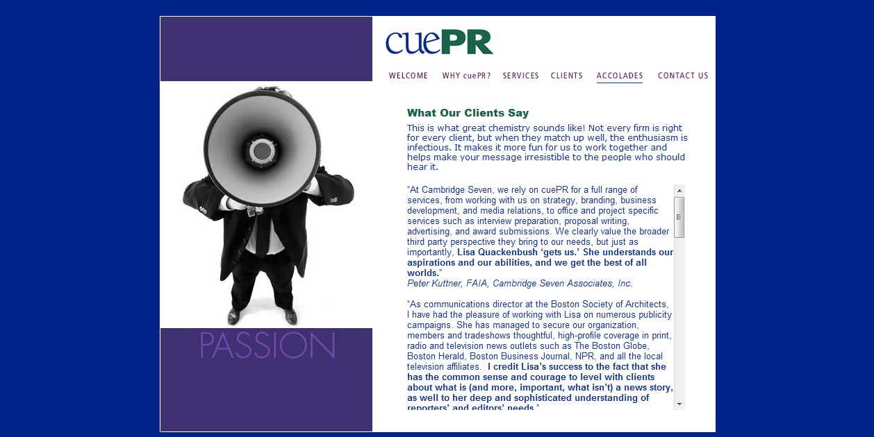 cuePR. Her dynamic, multi-faceted PR and marketing firm specializes in the design and architecture fields, which, frankly, makes it all the more fun for me! As the first of what I hope will be many projects together, we've created her website.